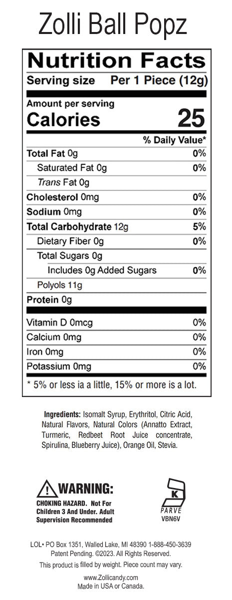 Zolli Ball Popz INGREDIENTS: Isomalt Syrup, Erythritol, Citric Acid, Natural Fruit Flavors, Colors from Fruits and Vegetables (Annatto Extract, Turmeric, Redbeet Root Juice, Spirulina, Blueberry Juice), Orange Oil, Stevia.