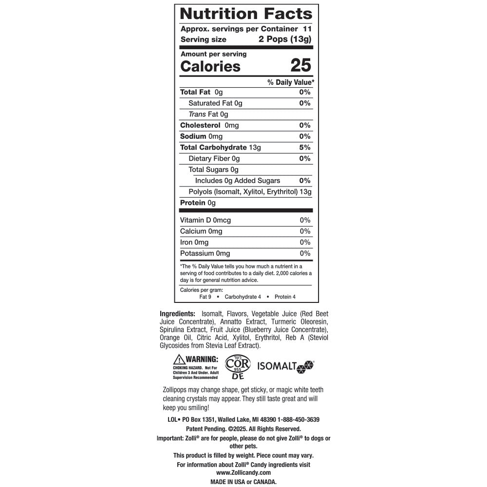 Zollipops INGREDIENTS: Isomalt, Citric Acid, Xylitol, Erythritol, Flavors, Vegetable Juice (Red Beet Juice Concentrate), Annatto Extract, Turmeric Oleoresin, Spirulina Extract, Fruit Juice (Blueberry Juice Concentrate), Orange Oil, Reb A (Steviol Glycosides from Stevia Leaf Extract).